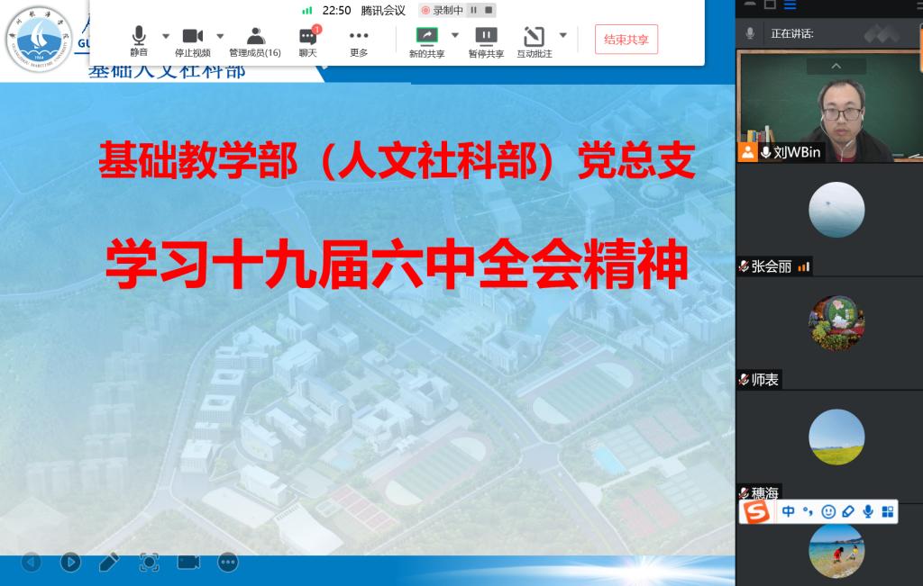 11月14日下午3点,基础教学部(人文社科部)党总支通过线上腾讯会议开展专题学习活动--学习党的十九届六中全会精神,全体党员参加会议,会议由教工第一党支部书记刘卫斌同志主持。