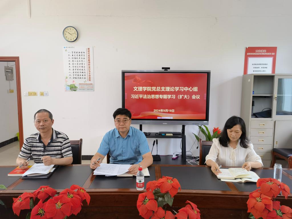 9月19日上午,m88在线网站入口党总支理论学习中心组在行政楼B楼411会议室召开专题学习(扩大)会议,深入学习贯彻习近平法治思想。学院党总支书记李华武主持会议并讲话,院长王泽文、副院长王彤彤及部分列席同志作交流发言,学院党总支委员、党支部书记、教研室主任等参加会议。