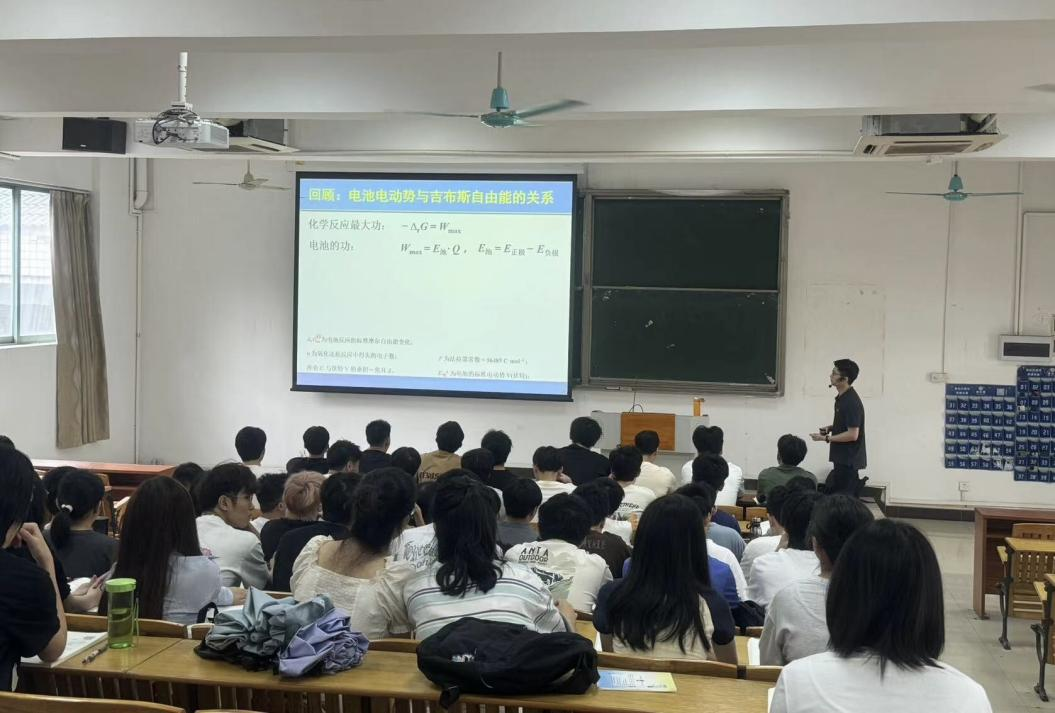 梁晓旭老师从能斯特方程的推导及其影响因素开启内容导入,讲授了电极电势的应用,内容丰富,重难点突出。梁晓旭老师以良好的专业素养和熟练的教学技巧,成功地从实际科研、生产中的不同角度向学生们展示了电极电势的多种应用场景,公式推导过程详细,讲课节奏把握得当。