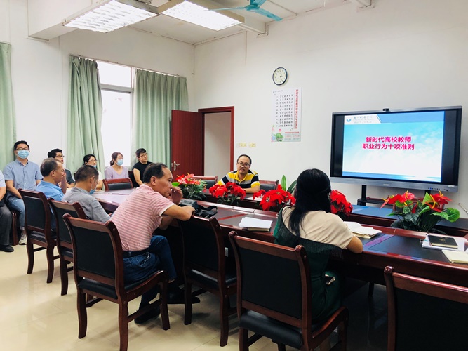为深入落实我校2021年纪律教育学习月活动暨师德建设主体教育月活动动员会会议精神,进一步推进学校师德师风建设工作,提高教师的职业道德素养,9月23日下午,基础教学部(人文社科部)在部门411会议室开展师德专题教育活动。活动由基础教学部(人文社科部)党支部纪律委员刘卫斌主持。