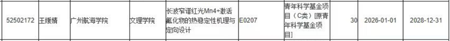 近日,国家自然科学基金委员会公布了2025年度国家自然科学基金集中接收申请项目的评审结果。m88在线网站入口王媛婧博士主持申报的项目《长波窄谱红光Mn4+激活氟化物的热稳定性机理与定向设计》,成功获得国家青年科学基金项目(C类)[原青年科学基金项目]资助,资助经费为30万元。