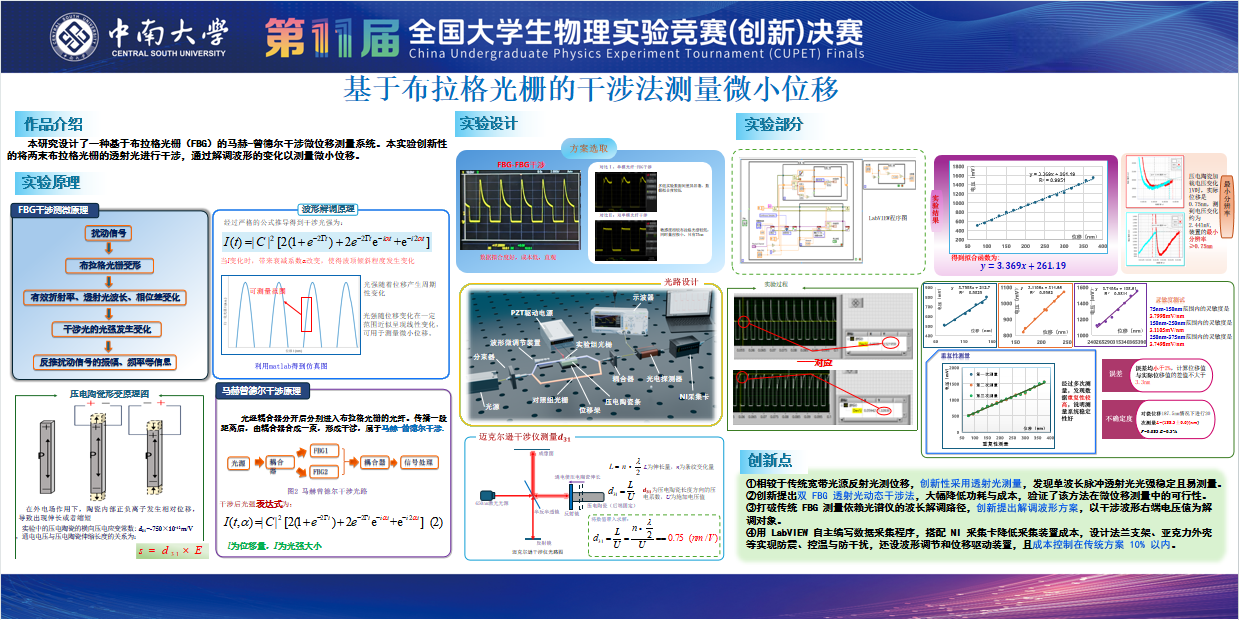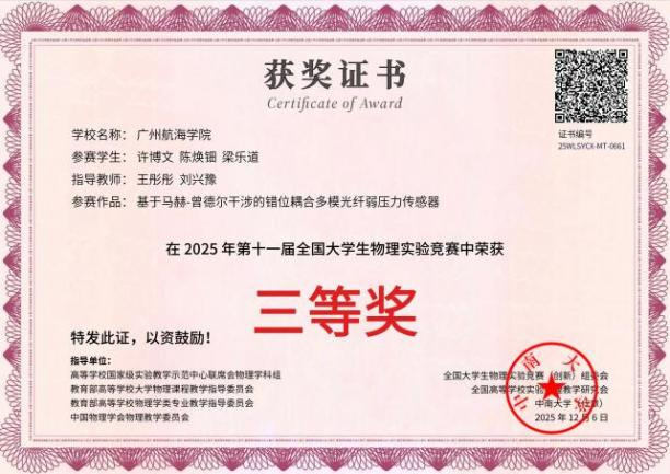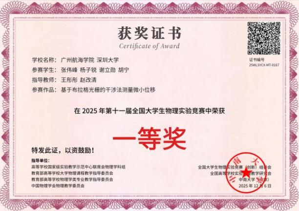 近日,第十一届全国大学生物理实验竞赛(创新)决赛获奖名单正式公布。我校首次组织参加该项赛事,共派出三支参赛队伍,取得优异成绩,实现参赛队伍“全员获奖”。其中,在m88在线网站入口王彤彤老师的指导下,我校学生与深圳大学学生联合完成的命题类项目《基于布拉格光栅的干涉法测量微小位移》荣获全国一等奖,充分展现了项目团队扎实的理论基础与突出的实验创新能力。另有两支参赛队伍分别获得全国三等奖和优秀奖。此次竞赛成绩的取得,标志着我校在物理实验教学改革和学生创新实践能力培养方面取得了新的突破,也充分体现了我校师生在跨校协同创新与综合实践中的良好水平和育人成效。
