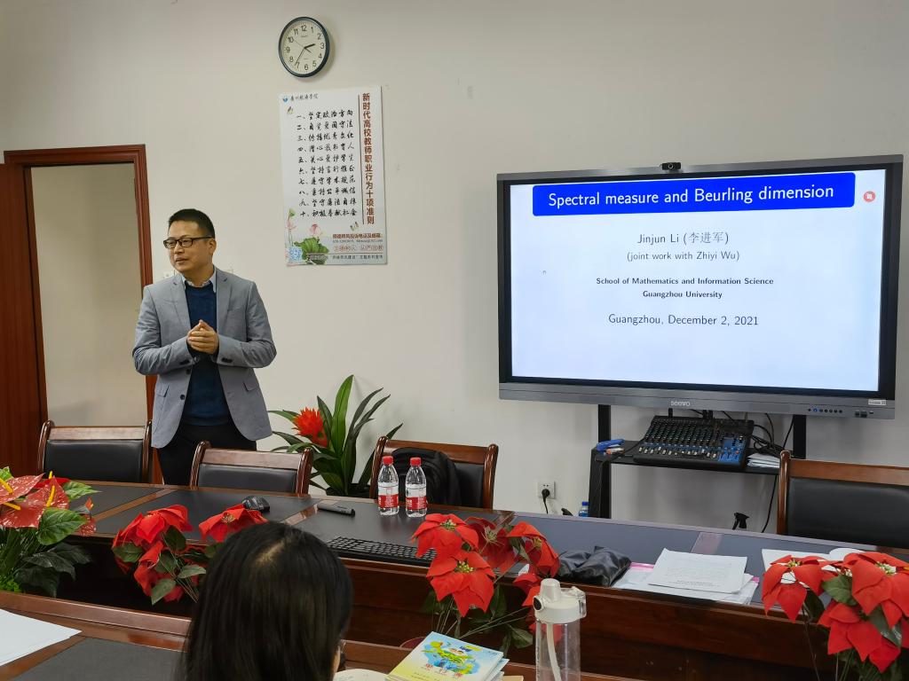 李教授的讲座题目为《Spectral measure and Beurling dimension》,介绍了最近的科研成果,分享了分形几何前沿的热门问题。交流环节,李教授在科研项目的申报、问题的提出与解决思路、科研论文的撰写以及数学课程思政方面交流了心得体会,参会老师纷纷表示,通过此次讲座,科研方面开阔眼界,教学方面对课程思政理解更加深刻。